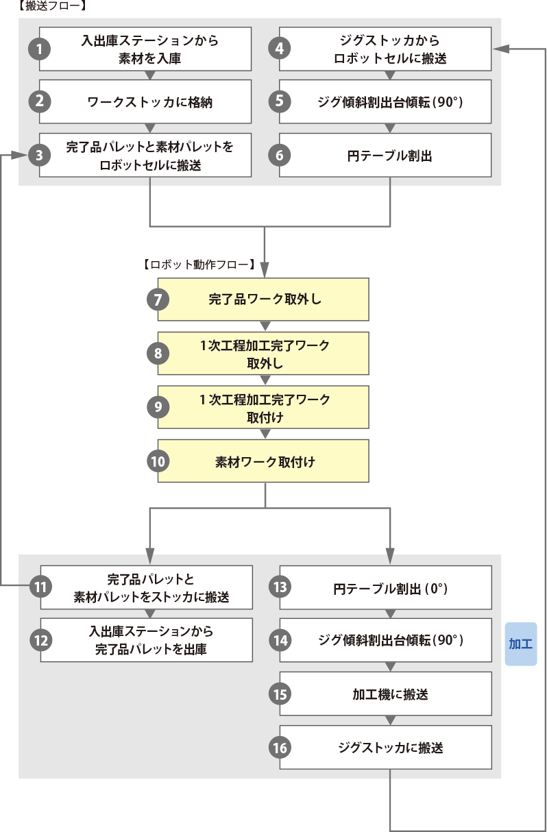 1セル2台のロボットセルを2セル配置し、片方がメンテナンス中でも生産が継続可能です。ワークストッカー、ジグストッカーも組み合わせ、24時間自動運転を実現すると同時に、生産計画に応じたスケジュール管理によって納期が近いワークから優先的に生産を行います。